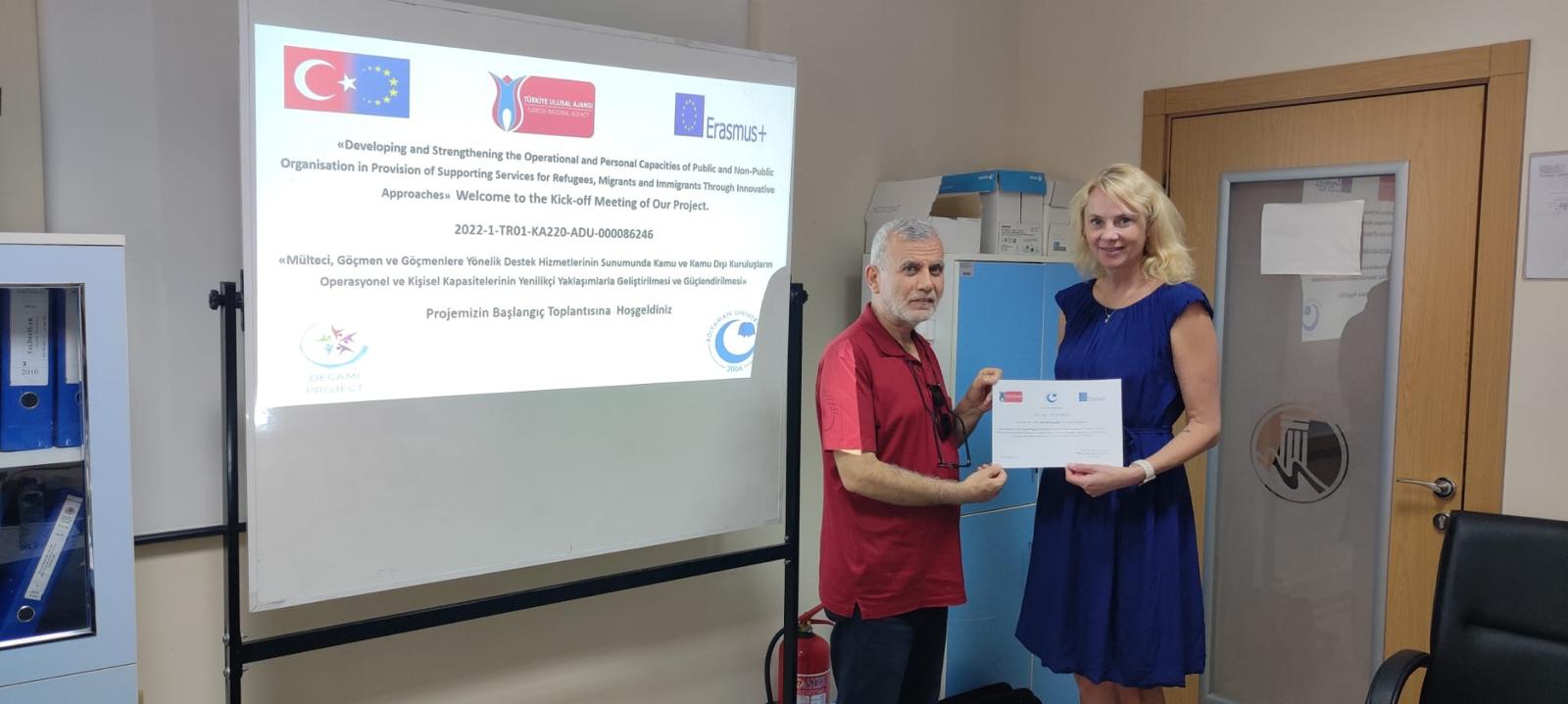 Decami Projesinin açılış toplantısı 20-21 Şubat 2023 tarihlerinde Adıyaman’da Adıyaman üniversitesinin ev sahipliğinde planlanmıştı. 6 Şubat Depreminden dolayı başlangıç toplantısı 11-12 ağustos 2023 tarihlerinde Mersin’de Mersin Üniversitesi’nin ev sahipliğinde gerçekleştirilmiştir. Toplantıya proje ortakları eksiksiz katılmıştır. Ayrıca Mersin’deki başlangıç toplantısına Ulusal ajanstan Yetişkin Eğitimi Koordinatörü Dr. Kemal BAŞÇI ve Uzman Merve ÖNEM katılmıştır. Toplantıda proje süreçleri, yönetimi ve planlaması üzerine detaylı görüşmeler yapılmıştır.
